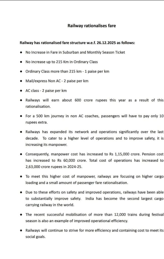 Railway Ticket Hike: अगर आप अक्सर ट्रेन से सफर करते हैं, तो यह खबर आपके बजट को थोड़ा प्रभावित कर सकती है. भारतीय रेलवे ने मेल और एक्सप्रेस ट्रेनों के किराए में बढ़ोतरी करने का फैसला किया है. यह नया किराया ढांचा नए साल से कुछ दिन पहले यानी 26 दिसंबर 2025 से लागू होगा. खासकर लंबी दूरी की यात्रा करने वाले यात्रियों को अब पहले के मुकाबले ज्यादा पैसे चुकाने होंगे.
