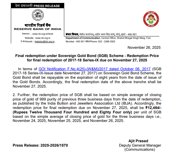 आरबीआई ने सॉवरेन गोल्ड बॉन्ड (एसजीबी) 2017-18 सीरीज-IX की रिडेम्प्शन प्राइस का ऐलान किया है. निवेशक 27 नवंबर, 2025 यानी आज इन बॉन्ड्स को भुना सकते हैं. रिडेम्प्शन प्राइस 12,484 रुपये प्रति यूनिट तय हुआ है, जो बॉन्ड जारी होने के प्राइस 2,914 रुपये प्रति ग्राम से लगभग 330 फीसदी अधिक है. इसके साथ ही निवेशकों को 2.50 फीसदी वार्षिक ब्याज का लाभ भी मिलता रहा है.