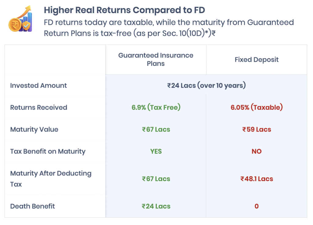 दूसरी बड़ी खासियत यह है कि अगर आपकी प्रीमियम राशि नियमों के भीतर रहती है, तो धारा 10(10D) के तहत मिलने वाली पूरी मैच्योरिटी राशि टैक्स-फ्री हो जाती है. यानी जितना रिटर्न मिलेगा, वह पूरा का पूरा आपके अकाउंट में आएगा, उस पर कोई टैक्स नहीं लगेगा. इसके विपरीत, FD में मिलने वाला ब्याज पूरी तरह टैक्सेबल होता है और हाई टैक्स स्लैब वाले लोगों को FD से असल में मिलने वाला रिटर्न काफी कम हो जाता है. इस वजह से GRP टैक्स बचत के मामले में भी FD से कहीं बेहतर साबित होते हैं.