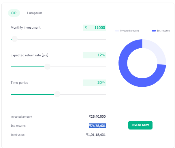 उदाहरण के तौर पर अगर कोई निवेशक 20 साल तक हर महीने 11000 रुपये की SIP करे और उसे अनुमानित 12% का वार्षिक रिटर्न मिलता रहे तो उसके पास 1,01,18,431 रुपये का फंड जमा हो जाएगा. इसमें उसने 26,40,000 रुपये का निवेश किया और उसे 74,78,431 रुपये का गेन हुआ.