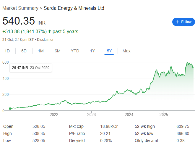 पिछले पांच साल में Sarda Energy & Minerals ने 26.47 रुपये से 540 रुपये तक का सफर तय करते हुए 1941 फीसदी का मल्टीबैगर रिटर्न दिया है. हालांकि, पिछले एक साल में कंपनी के शेयर का प्रदर्शन औसत ही रहा है. लेकिन, सैमको के मुताबिक अब कंपनी एक बड़े ब्रेकआउट जोन में है, जहां से इसमें 70 फीसदी से ज्यादा अपसाइड का मोमेंटम देखने को मिल सकता है.