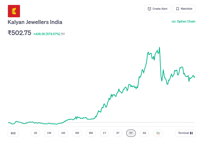 कल्याण ज्वेलर्स भारत की बड़ी ज्वेलरी कंपनियों में से एक है. भारत के अलावा मिडिल ईस्ट और अमेरिका में भी इसके स्टोर हैं. कंपनी सोने, हीरे और कीमती पत्थर की ज्वेलरी का कारोबार करती है. कंपनी के पास कुल 436 शोरूम हैं. कंपनी की मार्केट वैल्यू 52046 करोड़ रुपये से ज्यादा है और शेयर की कीमत 502 रुपये है. मिडिल ईस्ट में इस बार कमाई 8 प्रतिशत बढ़ी और मुनाफा 15 करोड़ रुपये रहा. भारत में 300 से ज्यादा स्टोर हैं जिनमें ज्यादातर फ्रैंचाइजी मॉडल पर चलते हैं. इसने पिछले पांच साल में 580 फीसदी का रिटर्न दी है.