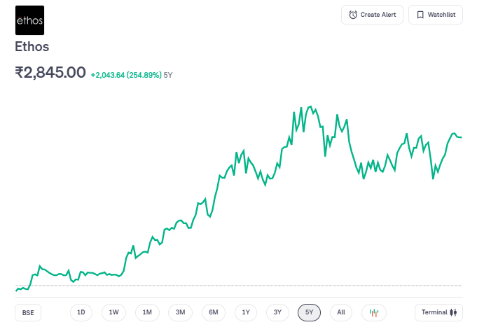 एथोस लिमिटेड भारत की सबसे बड़ी लग्जरी घड़ियों की चेन चलाने वाली कंपनी है. अभी इसकी मार्केट कैपिटलाइजेशन 7,676 करोड़ रुपये है और शेयर की कीमत 2,869 रुपये चल रही है. कंपनी के 86 बुटीक हैं जिनमें 83 घड़ी के स्टोर और 3 लाइफस्टाइल आउटलेट हैं और 80 से ज्यादा ग्लोबल ब्रांड्स बेचते हैं. इस कंपनी के निवेशकों को बीते पांच साल में औसत 185 फीसदी से अधिक का रिटर्न मिला है.