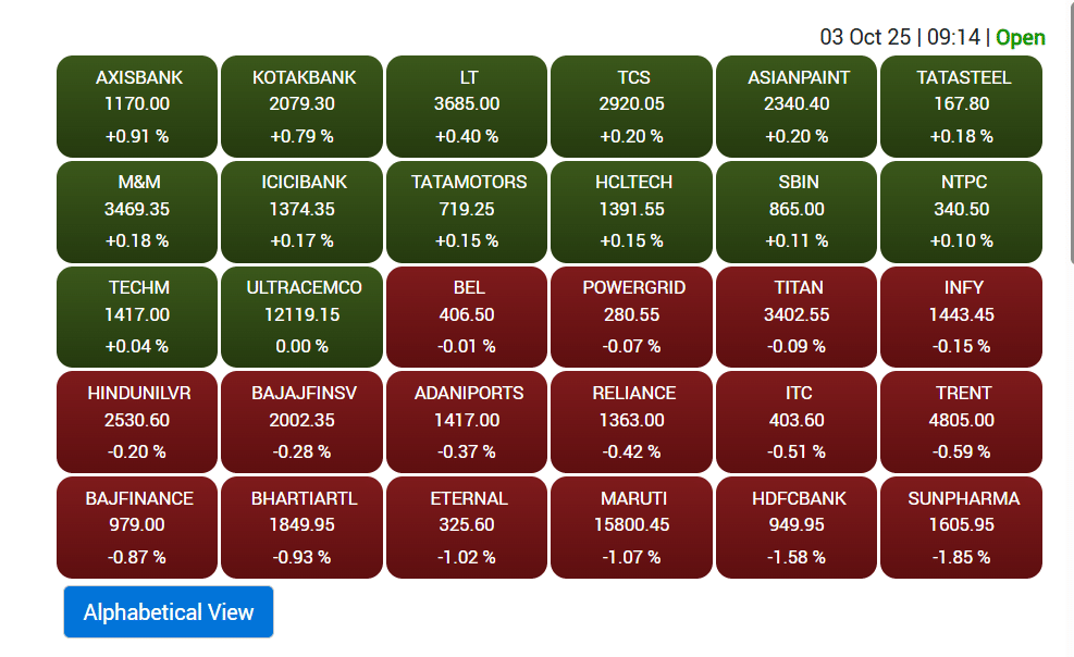 Stock Market Opening Bell: आज, 3 अक्टूबर को बाजार गिरकर खुला. शुरुआती कारोबार में सेंसेक्स 182 अंकों की गिरावट के साथ 80,767 के लेवल पर, वहीं निफ्टी 58 अंक गिरकर 24,768 के स्तर पर कारोबार कर रहा था. इस दौरान सेंसेक्स के 30 शेयरों में 14 में तेजी और 16 में गिरावट देखने को मिली. इस दौरान निफ्टी के सेक्टोरल इंडेक्स में ऑटो, FMCG और मीडिया शेयरों में गिरावट देखने को मिली. वहीं, मेटल शेयरों में तेजी देखने को मिली.