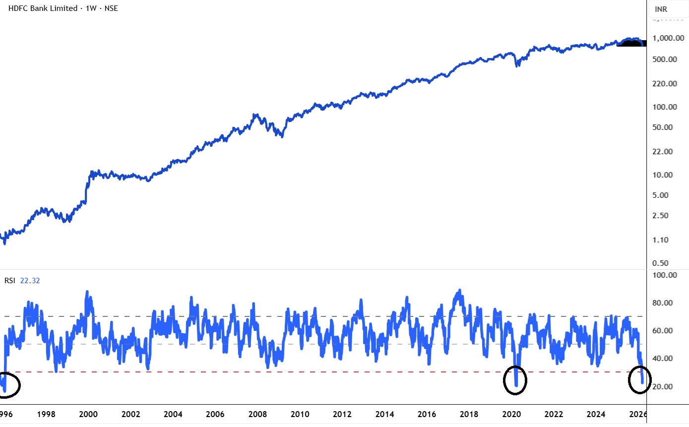 HDFC Bank का शेयर मर्जर के बाद करीब 1020 रुपये से गिरकर 770 रुपये तक आ गया है. इसका RSI 22 के आसपास है, जो बहुत कम है. ऐसा इसके इतिहास में सिर्फ तीन बार हुआ है. पिछली बार जब ऐसा हुआ था, तब बाद में शेयर ने अच्छा प्रदर्शन किया था.