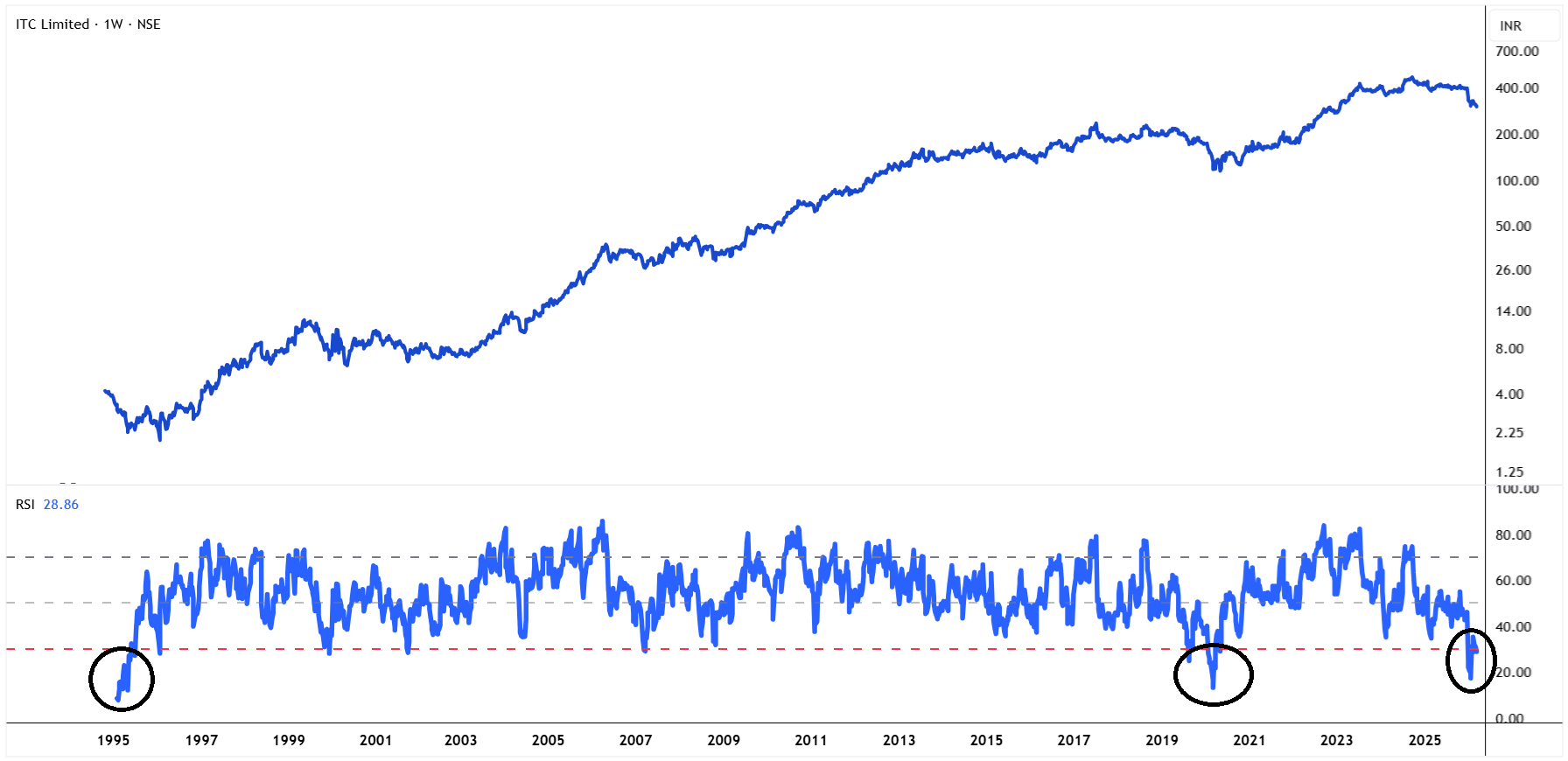 ITC का RSI 17 तक गिर गया था, जो बहुत कम स्तर है. इतिहास में ऐसा बहुत कम बार हुआ है. हर बार इसके बाद शेयर ने रिकवरी दिखाई है. यह कंपनी धीरे-धीरे लेकिन स्थिर तरीके से बढ़ती रही है.