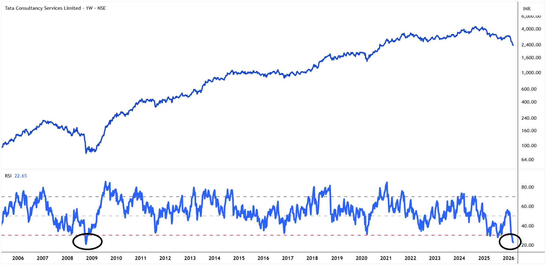 TCS जैसे मजबूत आईटी शेयर का RSI 2008 के बाद पहली बार इतना नीचे आया है. यह दिखाता है कि बाजार में डर ज्यादा है. लेकिन कंपनी की मजबूती अभी भी बनी हुई है. ऐसे समय में यह शेयर नजर रखने लायक बन जाता है.