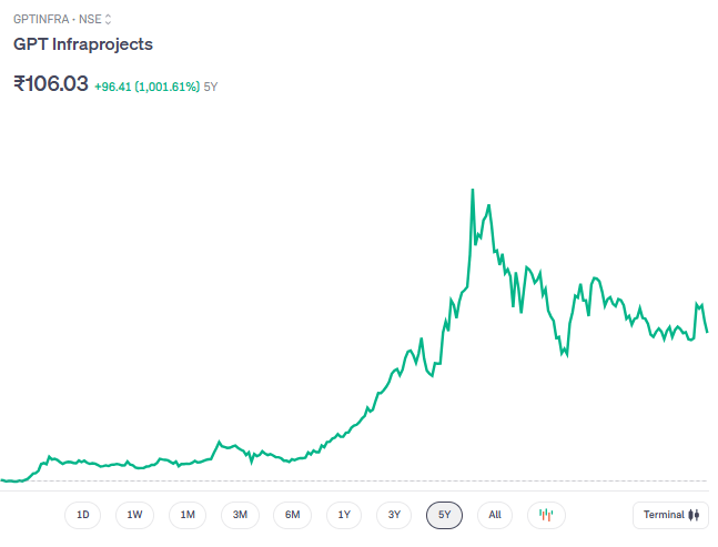 GPT Infraprojects की स्थापना 1980 में हुई थी और यह कोलकाता स्थित GPT ग्रुप की प्रमुख कंपनी है. कंपनी मुख्य रूप से रेलवे से जुड़े इंफ्रास्ट्रक्चर प्रोजेक्ट्स पर काम करती है. इसके अलावा कंपनी रेलवे के लिए कंक्रीट स्लीपर भी बनाती है और भारत के साथ अफ्रीका में भी सप्लाई करती है. कंपनी का मार्केट कैप करीब 1,339 करोड़ रुपये है. हाल ही में इसके शेयर करीब 106 रुपये पर बंद हुए.