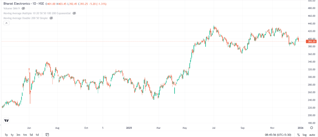 हालांकि सोमवार के कारोबार में BEL का शेयर कमजोरी के साथ ट्रेड करता दिखा. शेयर 1.31 प्रतिशत गिरकर 393.25 रुपये पर कारोबार कर रहा था. बीते एक हफ्ते में शेयर 1.43 प्रतिशत फिसला है. पिछली तिमाही में इसमें 1.68 प्रतिशत की गिरावट आई, जबकि एक साल में शेयर करीब 34.65 प्रतिशत चढ़ चुका है.