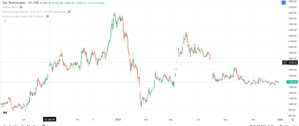 Zen Technologies का शेयर 29 दिसंबर को हल्की तेजी के साथ 1389.40 रुपये के भाव पर कारोबार करता नजर आया. इंट्राडे में शेयर करीब 1.06 प्रतिशत ऊपर रहा. पिछले एक हफ्ते में शेयर 0.37 प्रतिशत गिरा है. तिमाही आधार पर इसमें 2.59 प्रतिशत की कमजोरी आई है, जबकि एक साल में शेयर करीब 42 प्रतिशत तक टूट चुका है.