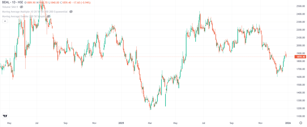 BEML का शेयर सोमवार को 0.94 प्रतिशत की गिरावट के साथ 1859.4 रुपये पर ट्रेड कर रहा था. बीते एक हफ्ते में शेयर 3.54 प्रतिशत चढ़ा है, लेकिन पिछली तिमाही में इसमें 8.26 प्रतिशत और एक साल में करीब 8.7 प्रतिशत की गिरावट दर्ज की गई है.