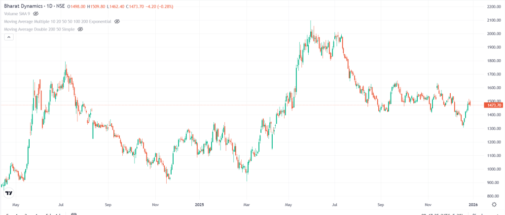 Bharat Dynamics का शेयर भी आज हल्की कमजोरी में रहा और 0.28 प्रतिशत गिरकर 1473.7 रुपये पर ट्रेड करता दिखा. पिछले एक हफ्ते में शेयर 3.52 प्रतिशत चढा है. तिमाही आधार पर इसमें 1.68 प्रतिशत की गिरावट आई है, जबकि एक साल में शेयर करीब 22.81 प्रतिशत की तेजी दिखा चुका है.