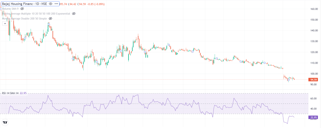 Bajaj Housing Finance एक RBI रेगुलेटेड अपर लेयर NBFC है और Bajaj Finance की सब्सिडियरी है. कंपनी होम लोन लोन अगेंस्ट प्रॉपर्टी और डेवलपर फाइनेंसिंग जैसे प्रोडक्ट्स देती है. बुधवार को कंपनी का मार्केट कैप 79532.13 करोड़ रुपये रहा. शेयर 94.59 रुपये पर बंद हुआ और RSI 22.95 रहा. RSI के आधार पर शेयर ओवरसोल्ड माना जा रहा है.