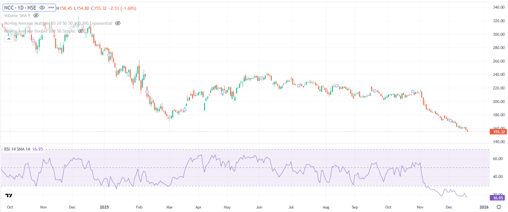 NCC एक बड़ी इंफ्रास्ट्रक्चर कंपनी है जो बिल्डिंग रोड-रेलवे वाटर सप्लाई इरिगेशन और इलेक्ट्रिकल जैसे कई सेक्टर में काम करती है. कंपनी देशभर में बड़े सरकारी और निजी प्रोजेक्ट्स पर काम कर रही है. बुधवार को NCC का मार्केट कैप 9904.28 करोड़ रुपये रहा. शेयर 155.32 रुपये पर बंद हुआ और RSI 16.95 रहा. यह RSI बताता है कि शेयर काफी ज्यादा दबाव में है और यहां से बाउंस की संभावना बन सकती है.