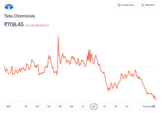 Tata Chemicals का Q3FY26 रेवेन्यू सालाना आधार पर करीब 1% घटा, जबकि EBITDA मार्जिन 9.7% पर आ गया। वैश्विक सोडा ऐश कीमतों में दबाव और कमजोर रियलाइजेशन से मार्जिन प्रभावित हुए. कंपनी ने 5,150 करोड़ रुपये के आयोडाइज्ड सॉल्ट प्लांट, 7,750 करोड़ रुपये के प्रीसिपिटेटेड सिलिका प्लांट और 1,350 करोड़ रुपये के सोडा ऐश विस्तार को मंजूरी दी है. शेयर करीब 65.7 गुना FY26 अनुमानित आय के मल्टीपल पर ट्रेड कर रहा है. इस शेयर ने पिछले 3 साल में 30 फीसदी का नेगेटिव रिटर्न दिया है.