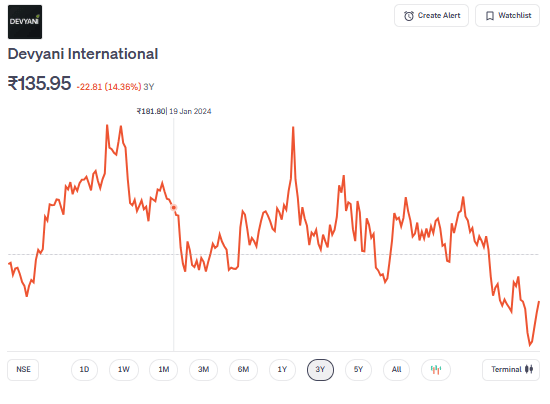 Devyani International का Q3FY26 राजस्व 11% बढ़ा है जबकि EBITDA मार्जिन 40 बेसिस प्वाइंट घटकर 15.8% रहा. नए स्टोर खुलने से ग्रोथ आई लेकिन समान स्टोर बिक्री कमजोर रही. कंपनी घाटे वाले Pizza Hut स्टोर बंद करने और नेटवर्क सुधार पर ध्यान दे रही है. प्रस्तावित Sapphire Foods मर्जर से सालाना 210-225 करोड़ रुपये की संभावित सिनर्जी का अनुमान है. इस शेयर ने पिछले 3 साल में 14.36 फीसदी का नेगेटिव रिटर्न दिया है.