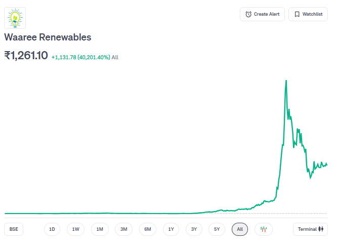 वारी रिन्यूएबल्स टेक्नोलॉजीज लिमिटेड Waaree Energies की एक सहायक कंपनी है. वारी रिन्यूएबल्स टेक्नोलॉजीज सौर ऊर्जा से संबंधित EPC (Engineering, Procurement, Construction) ठेके लेती है. यानी प्रोजेक्ट की डिजाइन, उपकरणों की खरीद और निर्माण से संबंधित काम करती है. आज इसके शेयर में 11 फीसदी का उछाल आया है. इस तेजी के बाद शेयर की कीमत 1265 रुपये पर कारोबार कर रहा है. लॉन्ग टर्म में ये स्टॉक निवेशकों के लिए सोने के अंडे देने वाली मुर्गी साबित हुई. पिछले 10 साल में निवेशकों को 40,201 फीसदी का मिल्टीबैगर रिटर्न मिला है. यानी 1 लाख रुपये 4,02,01,400 रुपये हो गया.