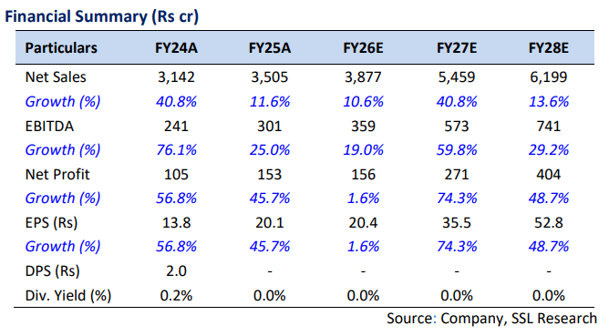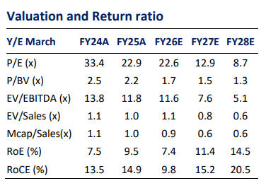 SBI Securities ने FY25–FY28 के लिए कंपनी के एस्टिमेट्स में कोई बदलाव नहीं किए हैं. इसके अलावा वैल्यूएशन को आकर्षक मानते हुए FY25 से FY28 तक डबल-डिजिट ग्रोथ की उम्मीद जताई है. FY27E P/E सिर्फ 12.9x और FY28E P/E 8.7x इस स्मॉलकैप मैन्युफैक्चरिंग कंपनी को अपने पीयर ग्रुप में काफी आकर्षक बनाते हैं. कंपनी अब कैपेक्स हैवी एक्सपेंशन के बाद बाद लीनर मार्जिन प्रोफाइल की ओर बढ़ रही है, जिससे आने वाले वर्षों में प्रॉफिटेबिलिटी और सुधरेगी.