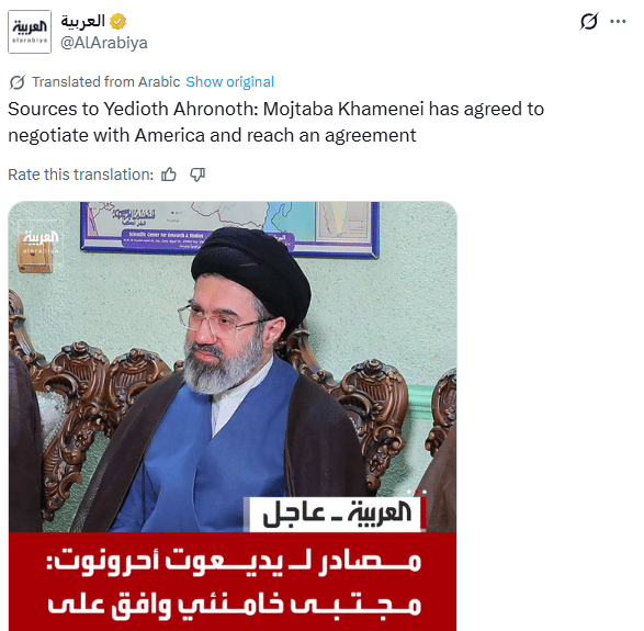 अल अरबिया के मुताबिक, खामेनेई ने संकेत दिए हैं कि वह मौजूदा संघर्ष के बीच अमेरिका के साथ वार्ता के लिए तैयार हैं, जिससे क्षेत्र में तनाव कम होने की उम्मीद जताई जा रही है. यह घटनाक्रम ऐसे समय सामने आया है जब अमेरिका के राष्ट्रपति डोनाल्ड ट्रंप ने घोषणा की कि वाशिंगटन और तेहरान के बीच पिछले 24 घंटों में बातचीत हुई है. ट्रंप के मुताबिक, इन वार्ताओं में “कई अहम बिंदुओं पर सहमति” बनी है.