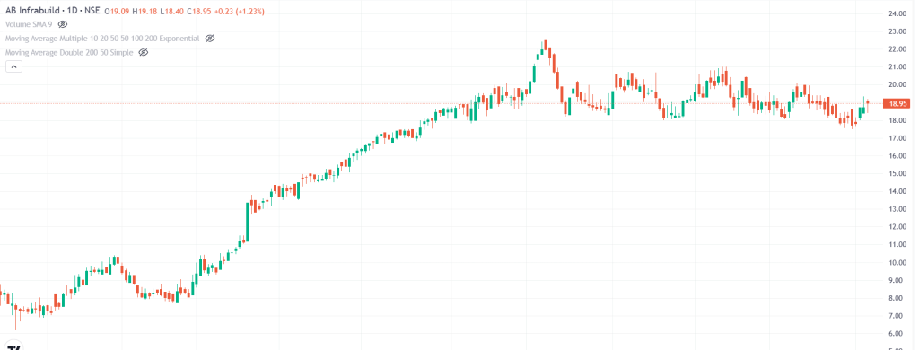 AB Infrabuild का शेयर इंट्रा डे में 1.23 प्रतिशत की तेजी के साथ ट्रेड करता दिखा. अभी इसके शेयरों का भाव 18.95 रुपये है. पिछले एक हफ्ते में शेयर 5.98 प्रतिशत चढ़ा है. वहीं पिछले तीन महीने में इसमें 4.58 प्रतिशत की गिरावट दर्ज की गई है. पिछले एक साल में शेयर ने 121.12 प्रतिशत का रिटर्न दिया है. यह शेयर अपने 52 वीक लो से करीब 207.13 प्रतिशत ऊपर है.