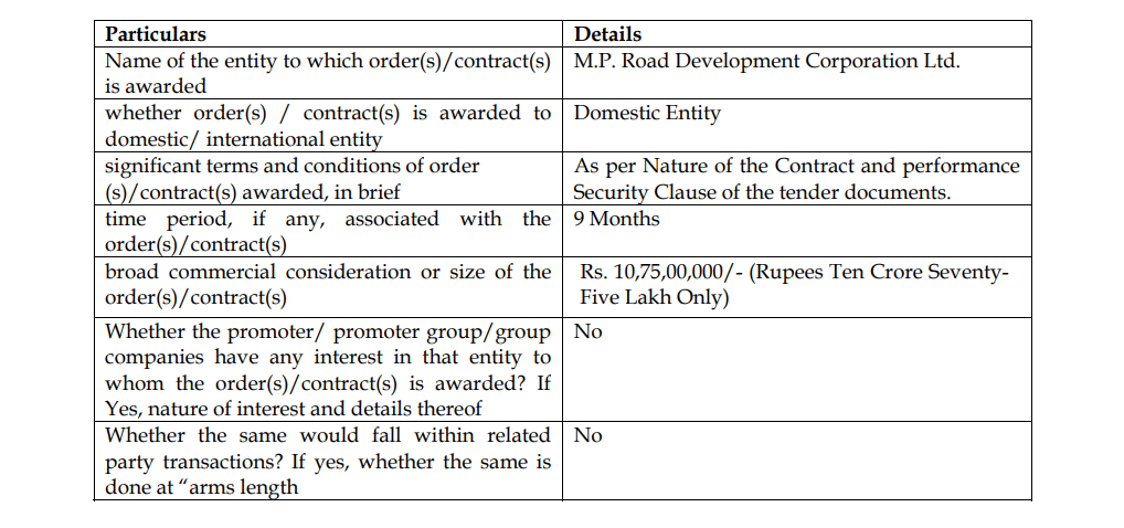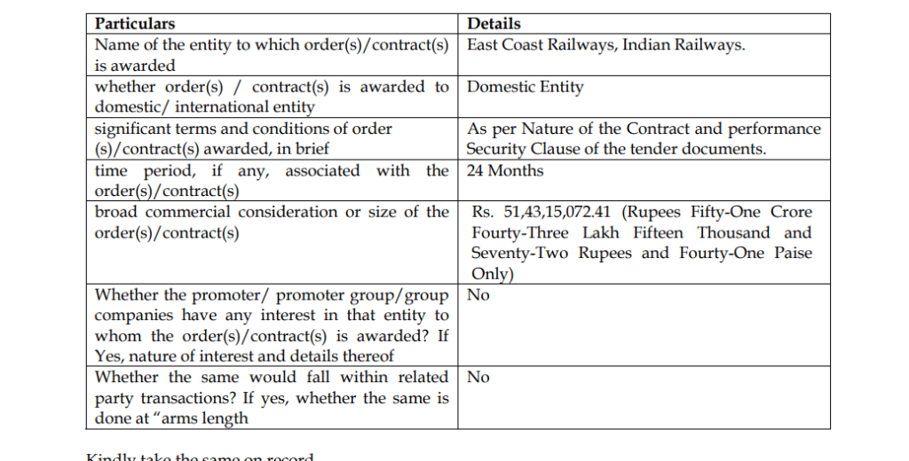 इसके अलावा AB Infrabuild Ltd को East Coast Railways Indian Railways से 51,43,15,072 रुपये का बड़ा ऑर्डर मिला है. कंपनी को इस प्रोजेक्ट के लिए लेटर ऑफ एक्सेप्टेंस भी मिल चुका है. यह प्रोजेक्ट मंडासा रेलवे स्टेशन और बरुवा रेलवे स्टेशन के बीच HWH VSKP मेन लाइन पर रोड ओवर ब्रिज के निर्माण से जुड़ा है. इसमें अलग अलग गर्डर स्पैन शामिल होंगे. इस प्रोजेक्ट को पूरा करने की समय सीमा 24 महीने रखी गई है. इन दोनों ऑर्डर को मिलाकर कंपनी की नई ऑर्डर वैल्यू 62,18,15,072 रुपये हो गई है.