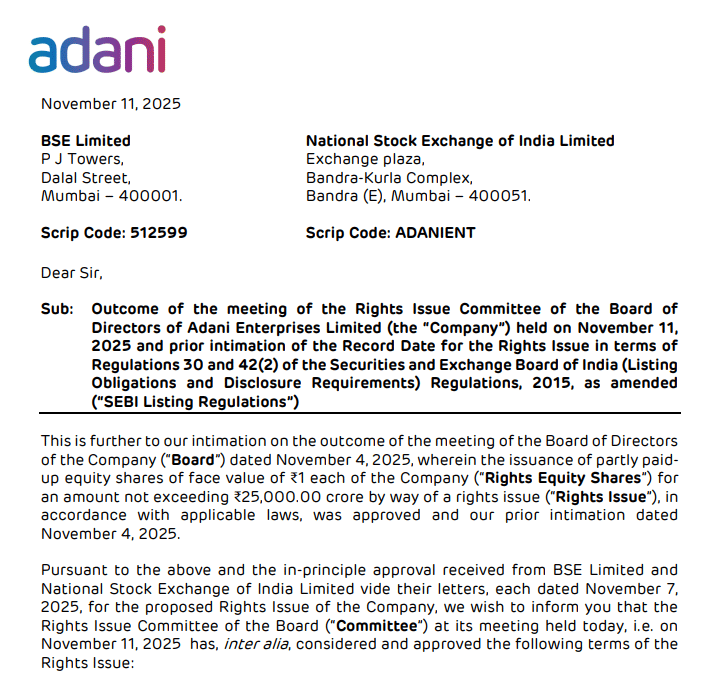 Adani Enterprises Ltd ने 25,000 करोड़ रुपये तक के Rights Issue को मंजूरी दी है, जिसके तहत कंपनी 1,800 रुपये प्रति शेयर की दर से 13.85 करोड़ इक्विटी शेयर जारी करेगी. यह मौजूदा बाजार भाव से करीब 24 फीसदी सस्ता है. कंपनी ने इस इश्यू के लिए 17 नवंबर 2025 को रिकॉर्ड डेट तय की है.