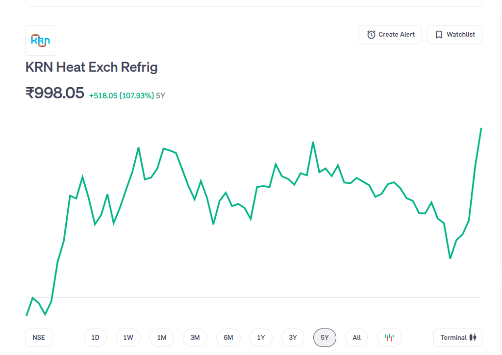 AI से जुड़े स्टॉक्स में KRN Heat Exchanger and Refrigeration का नाम तेजी से उभरा है. जनवरी के आखिर में जहां यह शेयर करीब ₹598 पर था, वहीं फरवरी के आखिर तक यह ₹998 के आसपास पहुंच गया. यानी सिर्फ एक महीने में करीब 60% की शानदार तेजी. अक्टूबर 2024 में लिस्ट हुए इस स्टॉक ने अब तक 107 फीसदी का मुनाफा अपने निवेशकों को दिया है.
