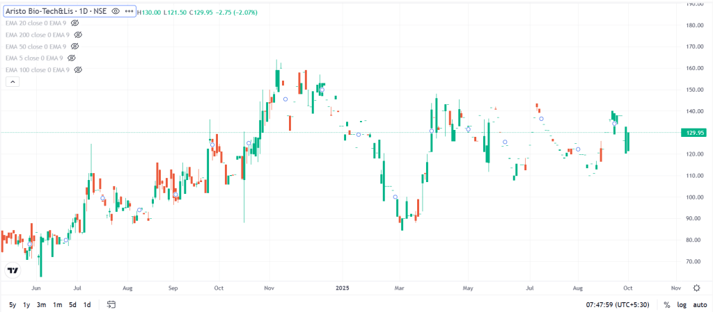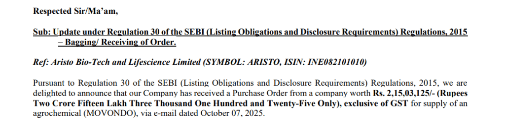Aristo Bio-Tech & Lifescience Share Price: माइक्रो-कैप एग्रोकेमिकल कंपनी अरिस्टो बायोटेक एंड लाइफसाइंस लिमिटेड (Aristo Bio-Tech & Lifescience Ltd) को 2,15,03,125 का घरेलू परचेज ऑर्डर मिला है. यह ऑर्डर 7 अक्टूबर 2025 को ईमेल के जरिए मिला है, जो एग्रोकेमिकल ‘MOVONDO’ की सप्लाई से जुड़ा है. इस ऑर्डर के चलते कंपनी को अपने वित्तीय प्रदर्शन में सुधार और ग्राहक आधार बढ़ाने में मदद मिलने की उम्मीद है. इस ऑर्डर की सप्लाई अवधि 20 अक्टूबर 2025 तक तय की गई है. शेयर अपने 52 हफ्ते के निचले स्तर 84.55 रुपये से अब तक करीब 53 फीसदी ऊपर कामकाज कर रहा है.