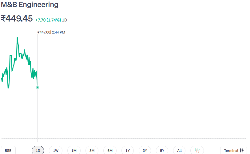 गुजरात स्थित एम एंड बी इंजीनियरिंग लिमिटेड(M & B Engineering Ltd) एक प्रतिष्ठित इंजीनियरिंग और कंस्ट्रक्शन कंपनी है. कंपनी प्री-इंजीनियर्ड बिल्डिंग्स (PEB) के क्षेत्र में डिजाइन, फैब्रिकेशन, सप्लाई और स्टील स्ट्रक्चर की इंस्टॉलेशन जैसी टर्नकी सेवाएं देती है. इसके प्रोजेक्ट्स मुख्य रूप से वेयरहाउसिंग, फूड एंड बेवरेजेस, टेक्सटाइल, पावर, इन्फ्रास्ट्रक्चर और रेलवे सेक्टर में फैले हैं. इस कंपनी का मार्केट कैप 2,568 से अधिक करोड़ है. इसके शेयर 21 अक्टूबर को BSE पर 449.45 रुपये प्रति शेयर पर बंद हुए. आशीष कचोलिया की Bengal Finance and Investment ने इसमें 7.28 लाख शेयर खरीदे हैं जिससे इस कंपनी में उनकी हिस्सेदारी 1.27% हो गई है.