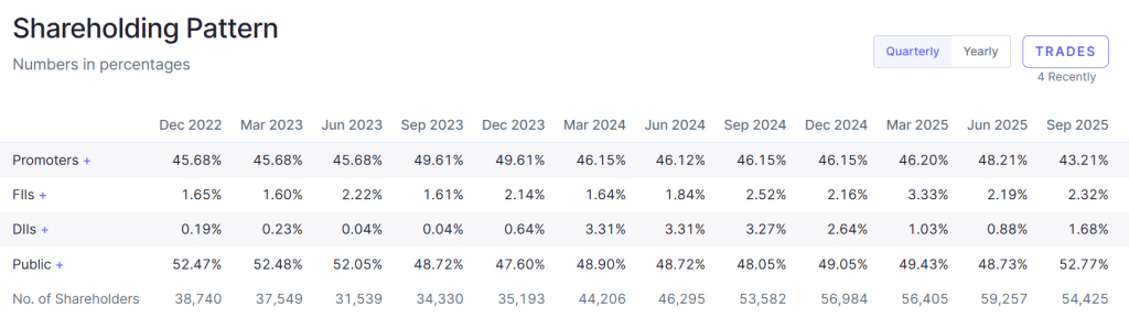 सभी के साथ घरेलू संस्थागत निवेशकों (DII) की हिस्सेदारी भी इस दौरान 0.88 फीसदी से बढ़कर 1.68 फीसदी हो गई. हालांकि, कंपनी में प्रमोटर्स की हिस्सेदारी में बड़ी गिरावट आई है. जून, 2025 तक उनके पास 48.21 फीसदी स्टेक था जो सितंबर में घटकर 43.21 फीसदी हो गया.