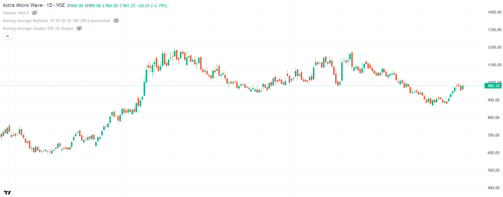 Astra Microwave का शेयर 31 दिसंबर 2025 को हरे निशान में 981.25 रुपये के आसपास कामकाज कर रहा था. पिछले एक हफ्ते में शेयर 1.13 प्रतिशत चढ़ा है. पिछली तिमाही में इसमें हल्की 0.27 प्रतिशत की गिरावट रही है. वहीं एक साल में शेयर ने 27.85 प्रतिशत की बढ़त दिखाई है. स्टॉक अपने 52 हफ्ते के निचले स्तर से करीब 67.96 प्रतिशत ऊपर आ चुका है.