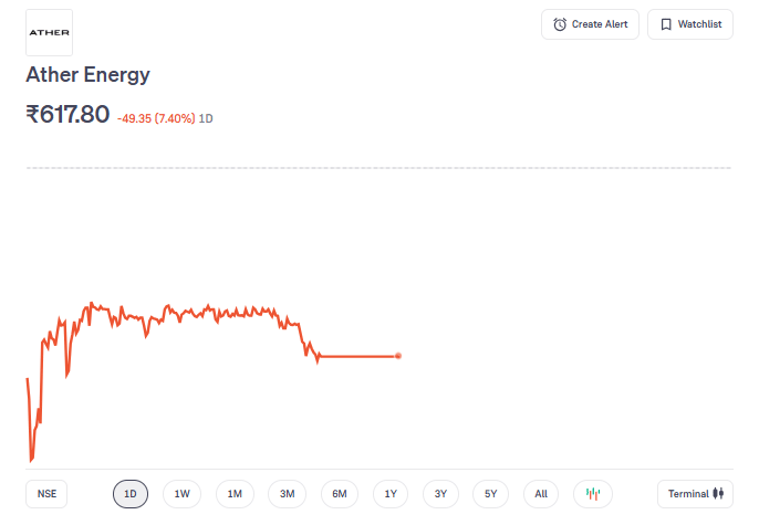 Ather Energy shares plung 11%: एथर एनर्जी लिमिटेड के शेयर गुरुवार 6 नवंबर को 11 प्रतिशत तक गिर गए. इसका मुख्य कारण शेयरधारकों का लॉक-इन खत्म होना और एक बड़ी ब्लॉक डील होना है. कंपनी के छह महीने का शेयरधारक लॉक-इन गुरुवार को खत्म हो गया. इससे 16.23 करोड़ शेयर ट्रेड के लिए खुले हो गए. ये शेयर कंपनी की कुल इक्विटी का 44 फीसदी हैं.