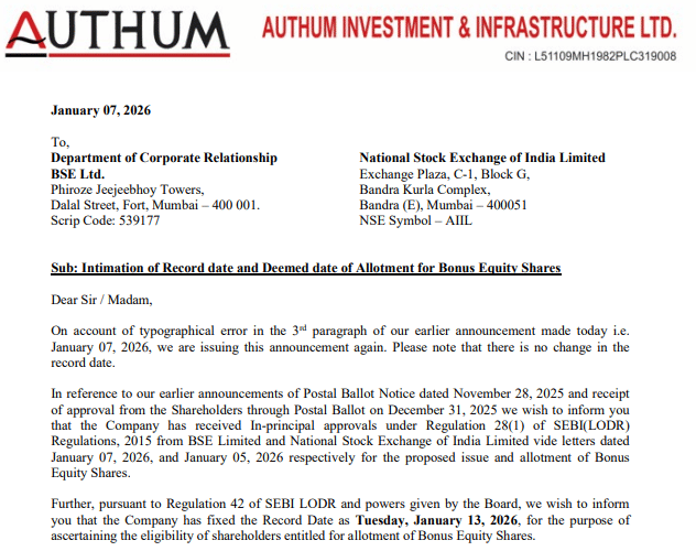 Authum Investment & Infrastructure: शेयर बाजार से जुड़ी एक अहम खबर सामने आई है. Authum Invstmnt ने अपने निवेशकों के लिए 4:1 के अनुपात में बोनस शेयर जारी करने का ऐलान किया है. इसका मतलब है कि जिन निवेशकों के पास कंपनी का 1 शेयर है, उन्हें उसके बदले 4 अतिरिक्त शेयर मिलेंगे. कंपनी ने बोनस शेयर से जुड़ी रिकॉर्ड डेट और डीम्ड डेट ऑफ अलॉटमेंट भी तय कर दी है. रिकॉर्ड डेट वह तारीख होती है, जिस दिन तक जिन निवेशकों के नाम कंपनी के रिकॉर्ड में होंगे, वही बोनस शेयर पाने के हकदार होंगे. साथ ही इस स्टॉक में विदेशी निवेशक जमकर दांव लगा रहे हैं.