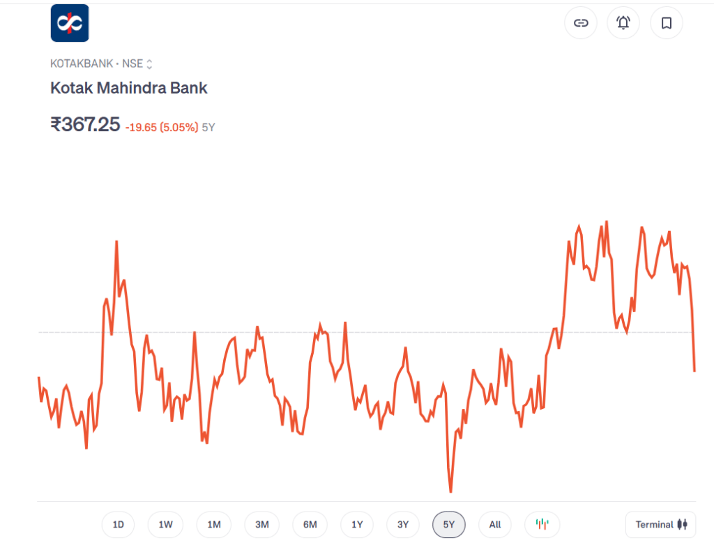 Kotak Mahindra Bank एक विविध वित्तीय सेवाएं देने वाला समूह है. बैंकिंग के अलावा यह निवेश बैंकिंग, स्टॉक ब्रोकिंग, व्हीकल फाइनेंस, एसेट मैनेजमेंट, लाइफ और जनरल इंश्योरेंस जैसी सेवाएं भी देता है. बैंक का मार्केट कैप करीब 3.73 लाख करोड़ रुपये है और शेयर करीब 367.25 रुपये पर ट्रेड कर रहा है. हालांकि पिछले एक साल में शेयर ने करीब 6.5 प्रतिशत की गिरावट दिखाई है, जबकि पांच साल में इसका रिटर्न -5 प्रतिशत रहा है.