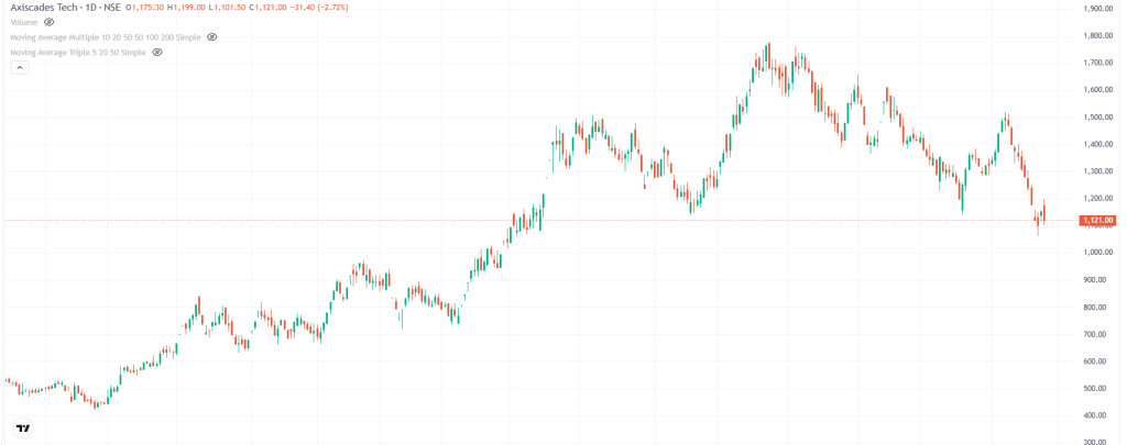 मंगलवार के कारोबार में AXISCADES Technologies का शेयर करीब 2.72 प्रतिशत की गिरावट के साथ 1,121 रुपये पर ट्रेड करता दिखा. पिछले एक हफ्ते में शेयर करीब 4.85 प्रतिशत टूटा है. वहीं बीते तीन महीनों में इसमें करीब 20.7 प्रतिशत की गिरावट आई है. हालांकि लंबी अवधि में शेयर ने निवेशकों को शानदार रिटर्न दिया है. पिछले एक साल में यह शेयर करीब 69 प्रतिशत चढ़ा है. कंपनी का मार्केट कैप 5,000 करोड़ रुपये से ज्यादा है. पिछले 5 साल में कंपनी का मुनाफा करीब 21.3 प्रतिशत CAGR की दर से बढ़ा है. शेयर ने एक साल में करीब 75 प्रतिशत का रिटर्न दिया है और 5 साल में करीब 2,200 प्रतिशत का मल्टीबैगर रिटर्न दे चुका है.