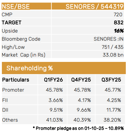 Bajaj Broking ने Senores Pharmaceuticals का टारगेट प्राइस 832 तय किया है. FY27E पर 30xPE के हिसाब से इसे “Buy” रेटिंग दी है. फिलहाल, इसका करंट मार्केट प्राइस 719 रुपये है. इस तरह यह स्टॉक एक साल के भीतर 16% तक रिटर्न दे सकता है.