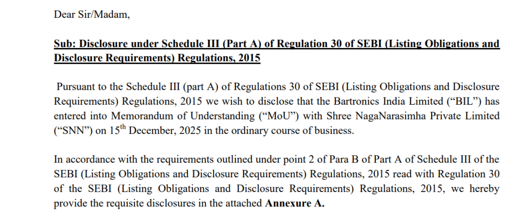 20 रुपये से कम का शेयर Bartronics India एक बार फिर चर्चा में आ गया है. कंपनी ने अपनी रणनीति को और मजबूत करते हुए Shree NagaNarasimha प्राइवेट लिमिटेड के साथ एक अहम समझौता किया है. इस डील के बाद कंपनी के शेयर फोकस में आ गए हैं. सितंबर 2025 तिमाही में विदेशी संस्थागत निवेशकों ने कंपनी में 9,74,924 शेयर खरीदे और अपनी हिस्सेदारी जून 2025 तिमाही के 1.68 फीसदी तक बढ़ा दी. हालांकि, शेयर अपने एक साल के हाई से 50 फीसदी गिरावट के साथ कारोबार कर रहा है.