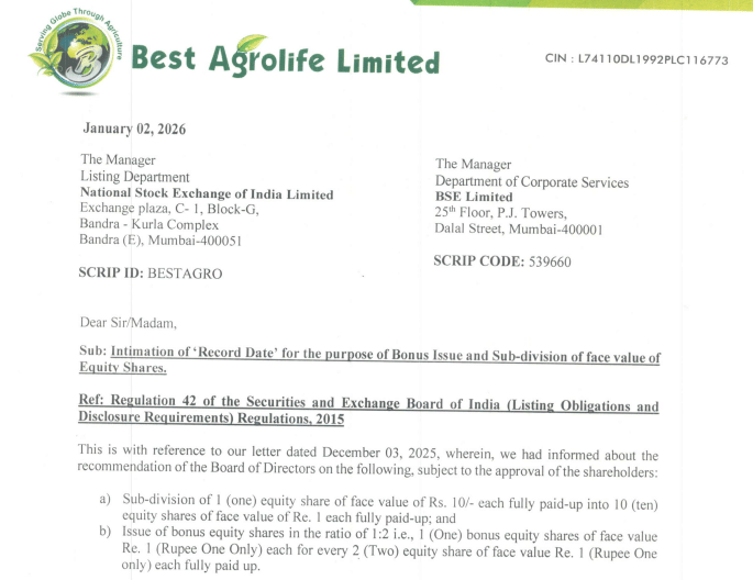 केमिकल और एग्रोकेमिकल सेक्टर की कंपनी Best Agrolife निवेशकों के लिए बड़ी खबर लेकर आई है. कंपनी ने एक साथ बोनस शेयर और स्टॉक स्प्लिट का ऐलान किया है, जिससे शेयरों की संख्या बढ़ेगी और निवेशकों के लिए यह ज्यादा सुलभ होगा. रिकॉर्ड डेट 16 जनवरी 2026 तय की गई है.