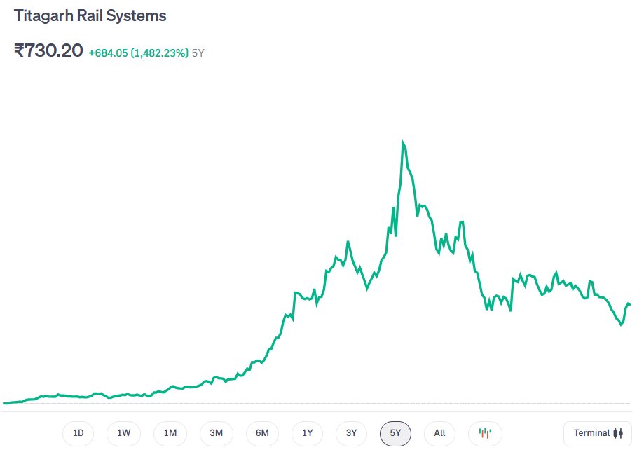 यह आंकड़े साफ करते हैं कि टीटागढ़ अब उस हाई-वैल्यू मार्केट में खेल रहा है, जहां मुनाफा ज्यादा दिख रहा है. कंपनी ने बीते पांच वर्षों में 1482 फीसदी का रिटर्न दिया है. मौजूदा वक्त में कंपनी के शेयर 730 रुपये पर ट्रेड कर रहे हैं.