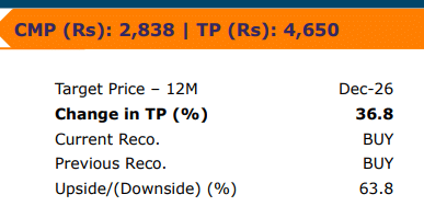 Emkay Research ने SPRL पर अपना टारगेट प्राइस बढ़ाकर 4,650 रुपये कर दिया है, जो पिछले अनुमान से 37% ज्यादा है. वहीं, करंट मार्केट प्राइस (CMP) Rs 2,838) के मुकाबले 63.8% अपसाइड ट्रेंड दिखाता है. रिपोर्ट के मुताबिक, यह स्टॉक अपने सेक्टर पीयर्स की तुलना में 57% डिस्काउंट पर सितंबर 2027 के एक्सपेटेड रेवेन्यू पर 16x PE पर ट्रेड कर रहा है.