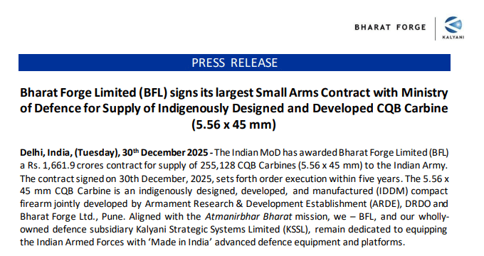 यह कॉन्ट्रैक्ट पर 30 दिसंबर 2025 को साइन किया गया जिसे अगले पांच वर्षों में पूरा किया जाएगा. यह करार आत्मनिर्भर भारत मिशन को मजबूती देने में महत्वपूर्ण भूमिका निभाएगा. CQB कार्बाइन को देश में इंडिजेनियस डिजाइन, डेवलप और मैन्युफैक्चर किया गया है. इस आधुनिक शॉर्ट रेंज फायरआर्म का विकास आरडेडई (Armament Research & Development Establishment), डीआरडीओ (Defence Research and Development Organisation) और भारत फोर्ज की सहयोगी कंपनी कल्याणी स्ट्रैटेजिक सिस्टम्स लिमिटेड (KSSL) ने मिलकर किया है. कंपनी ने एक बयान में कहा कि यह अनुबंध आत्मनिर्भर भारत मिशन के अनुरूप है. भारत फोर्ज और उसकी पूर्ण स्वामित्व वाली रक्षा क्षेत्र की सहायक कंपनी कल्याणी स्ट्रैटेजिक सिस्टम्स लिमिटेड (KSSL) भारतीय सशस्त्र बलों को ‘मेड इन इंडिया’ अत्याधुनिक रक्षा उपकरण और प्लेटफॉर्म उपलब्ध कराने के लिए प्रतिबद्ध हैं.