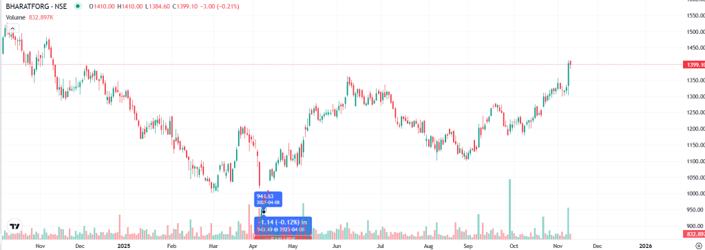 Bharat Forge Share Price: डिफेंस सेक्टर में बड़ी डील मिलने के बाद Bharat Forge के शेयरों में तेजी देखने को मिली. कंपनी की सब्सिडियरी Kalyani Strategic Systems Ltd (KSSL) को रक्षा मंत्रालय से 250 करोड़ रुपये से अधिक का ऑर्डर मिला है. मजबूत ऑर्डर बुक, स्थिर वित्तीय प्रदर्शन और डिफेंस एक्सपोर्ट पर फोकस कंपनी के लिए आगे अच्छे ग्रोथ संकेत दे रहे हैं. इस वजह से कंपनी के शेयर निवेशकों के रडार पर बने हुए हैं. इस कंपनी के शेयरों ने निवेशको को शानदार रिटर्न दिया है. पिछले हफ्ते इस शेयर ने अपना नया एक साल का हाई बनाया है. शेयर अपने एक साल के निचले स्तर 919 रुपये के भाव से लगातार बढ़ता जा रहा है.