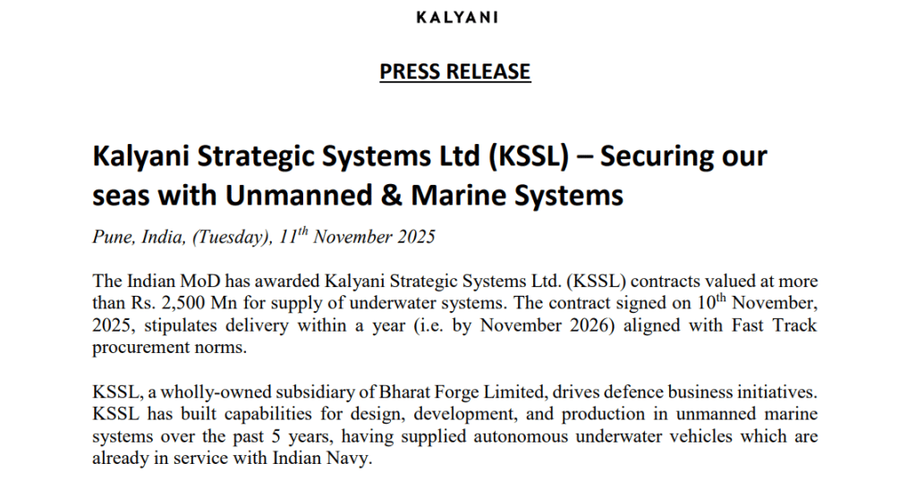Kalyani Strategic Systems Ltd (KSSL) ने भारतीय रक्षा मंत्रालय से अंडरवॉटर सिस्टम्स की सप्लाई के लिए 250 करोड़ रुपये से अधिक का ऑर्डर हासिल किया है. यह डिलीवरी नवंबर 2026 तक पूरी की जाएगी.