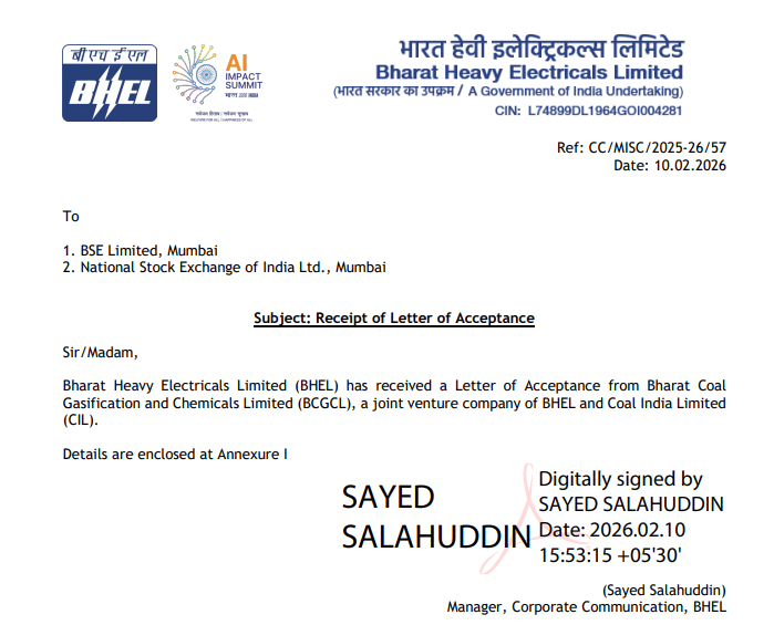 BHEL Received 2800 crore Order: सरकारी डिफेंस और इंजीनियरिंग कंपनी भारत हेवी इलेक्ट्रिकल्स लिमिटेड (BHEL) के हाथ एक बड़ी कामयाबी मिली है. कंपनी को 10 फरवरी को करीब ₹2,800 करोड़ का लेटर ऑफ एक्सेप्टेंस (LoA) मिला है. यह ऑर्डर कोल-आधारित केमिकल प्रोजेक्ट से जुड़ा है और इससे BHEL की ऑर्डर बुक को और मजबूती मिली है.
