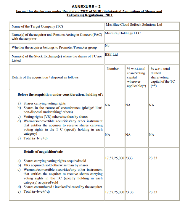 इस डील के तहत Siraj Holdings ने 17,57,25,000 इक्विटी शेयर खरीदे हैं, जिन पर पूरा वोटिंग अधिकार है. यह निवेश इसलिए भी खास है क्योंकि इससे पहले Siraj Holdings के पास Blue Cloud Softech का एक भी शेयर नहीं था. यानी यह कंपनी में उनकी पहली और बड़ी एंट्री है. स्टॉक एक्सचेंज को दी गई जानकारी के मुताबिक, Siraj Holdings कंपनी के प्रमोटर या प्रमोटर ग्रुप से जुड़ी नहीं है, बल्कि यह एक बाहरी अंतरराष्ट्रीय रणनीतिक निवेशक है.
