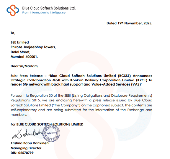 कंपनी ने 19 नवंबर को कोंकण रेलवे कॉर्पोरेशन लिमिटेड (KRCL) के साथ MoU साइन किया. यह समझौता नवी मुंबई में हुआ. इसके तहत तीन रेलवे स्टेशनों – मडगांव, रत्नागिरि और उडुपी में नई पीढ़ी की कनेक्टिविटी और मनोरंजन सुविधाएं शुरू की जाएंगी. ब्लू क्लाउड सॉफ्टेक 5G नेटवर्क के साथ हाई-स्पीड इंटरनेट, रियल-टाइम जानकारी समेत कई और सुविधा मुहैया कराएगी. पहले तीन स्टेशनों पर प्रूफ ऑफ कांसेप्ट (PoC) सफल रहा तो सेवाओं को पूरे कोंकण रेलवे नेटवर्क में फैलाया जाएगा.