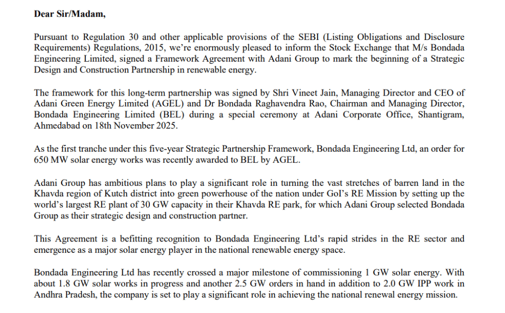 Bondada Engineering ने एक्सचेंज को बताया कि उसने Adani Group के साथ एक लांग टर्म की स्ट्रैटेजिक डील के लिए Framework Agreement किया है. यह डील 18 नवंबर 2025 को अहमदाबाद स्थित Adani Corporate Office में साइन हुई. Adani Green Energy Limited के MD और CEO श्री Vineet Jain और Bondada Engineering के CMD डॉ. Bondada Raghavendra Rao इस डील के दौरान मौजूद थे. इसके पहले चरण में Adani ने कंपनी को 650 MW के बड़े सोलर प्रोजेक्ट का काम सौंपा है.