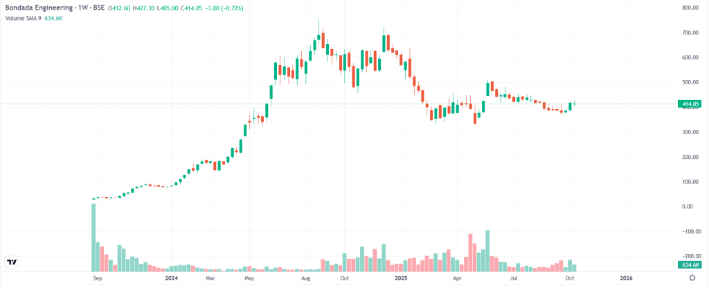 Bondada Engineering का शेयर बुधवार को 1.12 प्रतिशत की गिरावट के साथ 414.05 रुपये पर बंद हुआ. पिछले एक हफ्ते में यह शेयर 4.14 प्रतिशत बढ़ा है, जबकि पिछले एक साल में इसमें 28.92 प्रतिशत की गिरावट देखी गई है.