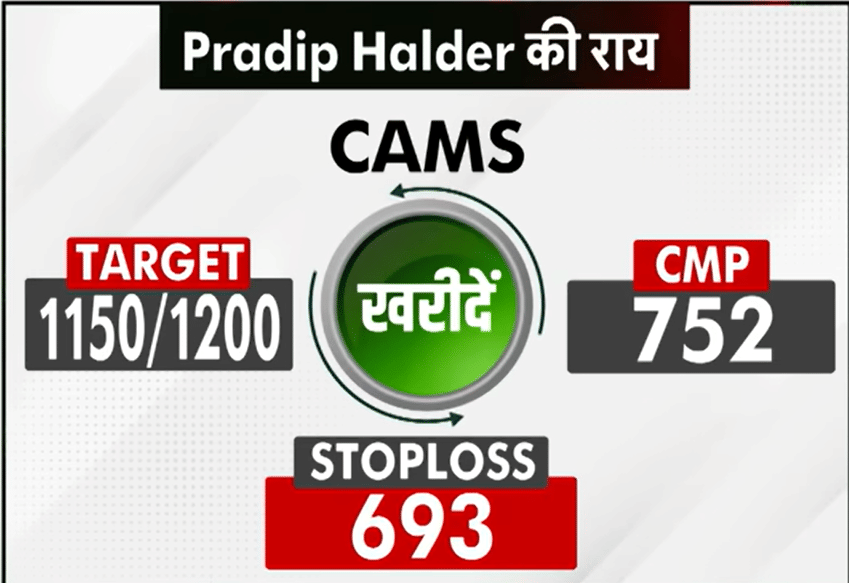 PHD Capital के Founder & CEO, Pradip Halder ने Money9Live से बातचीत में बताया कि CAMS के शेयर 1150 रुपये से 1200 रुपये तक चढ़ सकते हैं. शेयर का मौजूदा भाव 755.60 रुपये है. यानी शेयर के CMP से यह स्टॉक 58 फीसदी तक चढ़ सकता है. हालांकि, उन्होंने 693 रुपये का स्टॉप लॉस रखने की भी सलाह दी है.