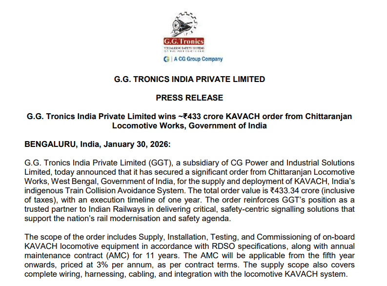 CG Power and Railway Kavach Order: इंजीनियरिंग क्षेत्र की दिग्गज कंपनी CG Power and Industrial Solutions Ltd को भारतीय रेलवे से जुड़ा एक बड़ा और अहम ऑर्डर मिला है. कंपनी ने शुक्रवार, 30 जनवरी को बताया कि उसकी सब्सिडियरी कंपनी GG Tronics India Private Ltd (GGT) को पश्चिम बंगाल स्थित चित्तरंजन लोकोमोटिव वर्क्स से KAVACH सिस्टम की डिमांड और तैनाती का ठेका मिला है. KAVACH भारत में विकसित किया गया ट्रेन टक्कर रोकने वाला सेफ्टी सिस्टम है, जिसे रेलवे सुरक्षा के लिहाज से बेहद अहम माना जाता है. इस ऑर्डर की कुल कीमत 433.34 करोड़ रुपये है, जिसमें टैक्स भी शामिल हैं. कंपनी को यह प्रोजेक्ट एक साल के भीतर पूरा करना होगा. इस सौदे से यह साफ होता है कि भारतीय रेलवे के आधुनिकीकरण और सुरक्षा से जुड़े प्रोजेक्ट्स में CG Power की सहयोगी कंपनी GGT की भूमिका लगातार मजबूत हो रही है.